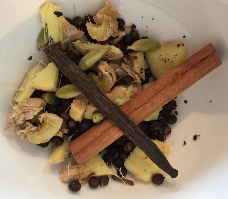 For my wild chai, I started by making a conventional version, partly to see if mine came up to scratch and also to help me create a comparable drink. For the traditional blend, I used half a pint of water and added a 2 inch cube of ginger root (sliced), 2 tsp of black pepper corns, 12 cloves, 8 cardamom pods and a 2 inch length of both vanilla pod and cinnamon stick, then brought it to the boil and simmered for 5 minutes. Then I added half a pint of whole milk, 2 tsp of black tea and 2 tsp of honey and simmered gently for another 5 minutes. Perfect, India in a teacup.